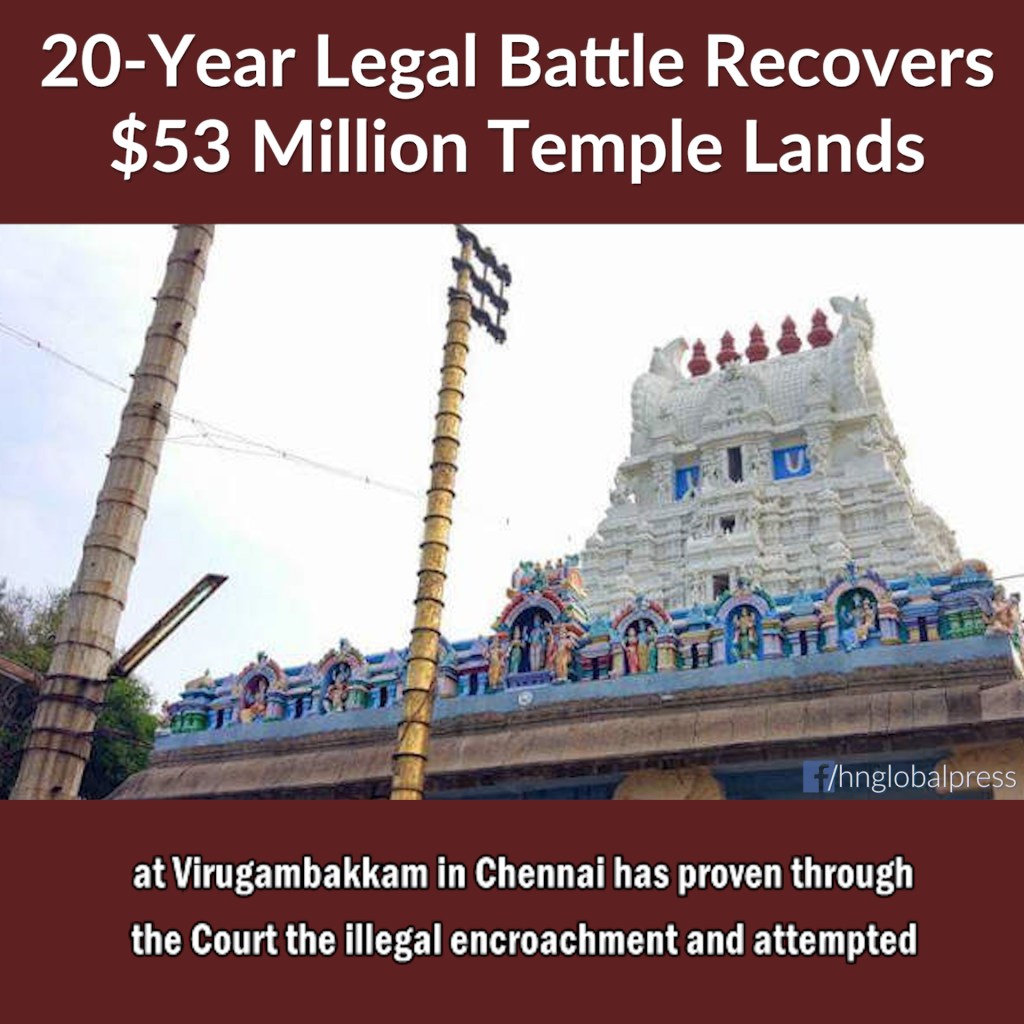 After more than 20 years of legal struggle the Sundara Varadaraja Perumal Mandir temple at Virugambakkam in Chennai has proven through the Court the illegal encroachment and attempted land grab of Temple lands worth over 400 crores rupees ($53 million USD). The Hindu Munnani and Temple Worshippers Society showed that 15 acres belonging to the Temple had been obtained by forged documents and fraudulent manner. The illegally obtained records have been cancelled. The Sundara Varadaraja Perumal Mandir at Virugambakkam in Chennai is more than 800 years old. It is administered by the Tamilnadu Hindu Religious and Charitable Endowments (HR & CE) Department which to date has been embroiled in many atrocities against Hindu temples including the encroachment of temple lands and disappearing temple Deities and artifacts. In the 18th century, Sunguvar Brahmins had gifted 15 acres of land known as ‘Mettu Kulam’ (upper pond) to the Virugambakkam temple for the purpose of distributing free water to devotees during the summer and other seasons. (Organiser) In 1997 certain political aspirants tried to grab the said 15 acres of land to build another religion’s religious building. A legal battle lasting more than 2 decades and involving forged documents, maps, and land registration references dating back nearly 150 years has now been brought to a close. Hindus really need a central register record for the very existence, and ongoings of Hindu Temples and all administrative and religious rights and activities. Visit Nithyanandapedia.org for insight on preserving the world’s oldest living civilization. In her order, the District Magistrate said “All claimants have failed to prove their right at the time of Revision survey and resettlement and Town survey operations…There is no legal heir certificate…which had to be produced”. Mr. Sankar involved in the case for the Temple said, “We will claim our ownership soon and remove all the encroachments. Neither the Courts nor the DM…[ordered] action against people who claimed temple land with forged documents. Why they failed to order a criminal case against them is baffling. During the pendency of the matter, I had received threats, aborted attacks, [and] luring conciliatory efforts with money offers”. (Organiser) The attempt to encroach lands of Sundara Varadaraja Perumal Mandir is just one among the hundreds of temple lands which have been similarly encroached and legalised using forged documents. (27 August 2020) ————————————— Visit us around the web: Facebook: https://facebook.com/HNGlobalPress Youtube: https://youtube.com/HinduismNow Twitter: https://twitter.com/HN_Global_Press Instagram: https://www.instagram.com/hinduismnowgp/ ————————————— #HinduismNow #News #Hinduism