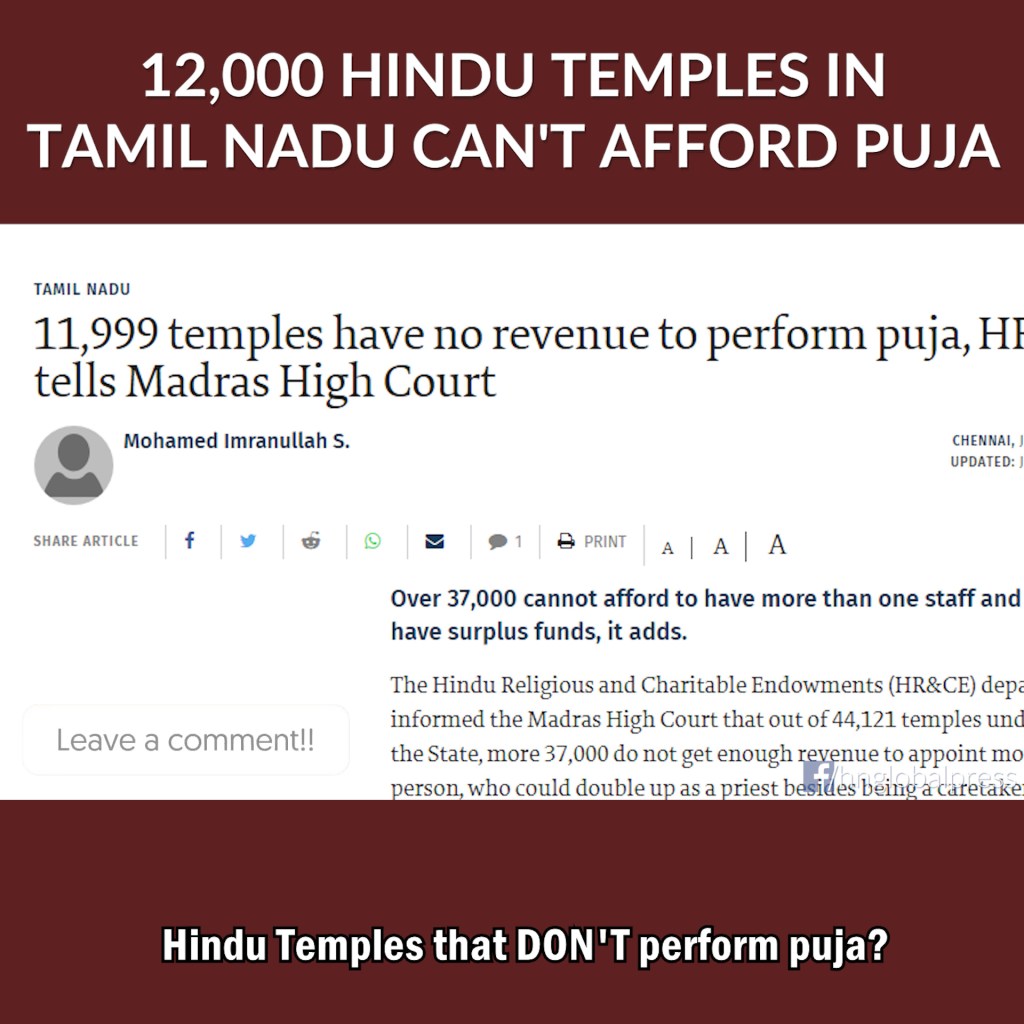 More than 25% of Hindu Temples in Tamil Nadu can’t afford to perform puja. According to the Hindu Religious and Charitable Endowments (HR&CE) department of Tamil Nadu, there are 11,999 Hindu Temples in the state who cannot afford to perform 1 puja per day. (TheHindu) Hindu Temples that DON’T perform puja? Yes – this is India, home to more than 1 billion Hindus, but remember, it’s not a “Hindu Country” – 1 billion Hindus in a single country is not enough to create a Hindu country. Actually, nowhere on the planet is there a Hindu country. There’s Christian countries, Muslim, Jewish, Buddhist, but not Hindu. For some reason, 1 billion Hindus in a country doesn’t warrant any country Constitution to ensure Hindu religion is protected – no place on Earth feels this is necessary. There’s more than 37,000 Hindu Temples in Tamil Nadu that can afford only a single person to take care of the place. Just 1 person. More than 37,000 Temples, and this is only one single state in a country of 1.4 billion people – a country that makes up by itself more than 17% of the global population – in a single state of this country there are 37,000 Temples here alone that have only a SINGLE PERSON struggling to keep the Temple open and many of them anyway don’t perform a single puja each day – because somehow we don’t have enough money. War and violence costs $14 trillion dollars every year but Hindu Temples can’t afford 1 puja. Human sex trafficking is a $100 billion business but Shri Padmanabhaswamy Temple can’t afford rice, Lord Balaji Temple can’t afford cleaners, and Tamil Nadu Temples can’t afford a single puja. Where are our priorities? 1 trillion animals are killed each year for human food but 4 billion people live on less than $5.50 per day and 800 million are suffering in chronic hunger. What are we running for? Still thinking a bigger bank balance will solve the world’s problems? The thing is, it’s not “THE WORLD’S problems” – it’s OUR problems. Who are “WE”? We don’t need to solve the world’s problems, we just need to address OUR problems. Just keep it simple. A single person’s greed and discontentment keeps us running for an entire lifetime never getting to where we are going, and losing sight of the fulfillment that lies beneath our noses. Not able to sit with ourselves, and not able to LIVE with our neighbours. Then where are we going? And why so fast? The only civilization to live 5000 years ago and STILL live today is Hinduism. Is there no reason for this? Then why still running for more dollars when it’s all dissolving anyway? The only way to LIVE with ourselves is to BE with ourselves. The only way to BE with OURSELVES is to SIT & LISTEN. Then why we won’t do this? Too much distraction? The only thing that kept inside solutions alive for us was the Master’s LIVING the Hindu conscious principles – today we’re still running for Engineering principles. The crisis of Corona is to get you to LOOK IN. It has always been and always will be the ONLY POSSIBLE SOLUTION for Me to live with Me. It’s not too old-fashioned or too overrated, it’s the only way to handle the changes coming with the “New Normal” and anything else that may happen that seems uncertain. The Enlightened Beings and sciences of Sanatana Hindu Dharma were not here for us to remember, or to forget, it’s here to help you NOW – but you have to USE it, you have to TAKE it. Start reading Upanishads, listening to meditation, aligning to your own Consciousness. Learn more about simple and updated LIFE for yourself and communities at kailaasa.org/globalservices and tinyurl.com/unclutchinginfo (9 September 2020) ————————————— Visit us around the web: Facebook: https://facebook.com/HNGlobalPress Youtube: https://youtube.com/HinduismNow Twitter: https://twitter.com/HN_Global_Press Instagram: https://www.instagram.com/hinduismnowgp/ ————————————— #HR&CE #TamilNadu #HinduismNow #News #Hinduism